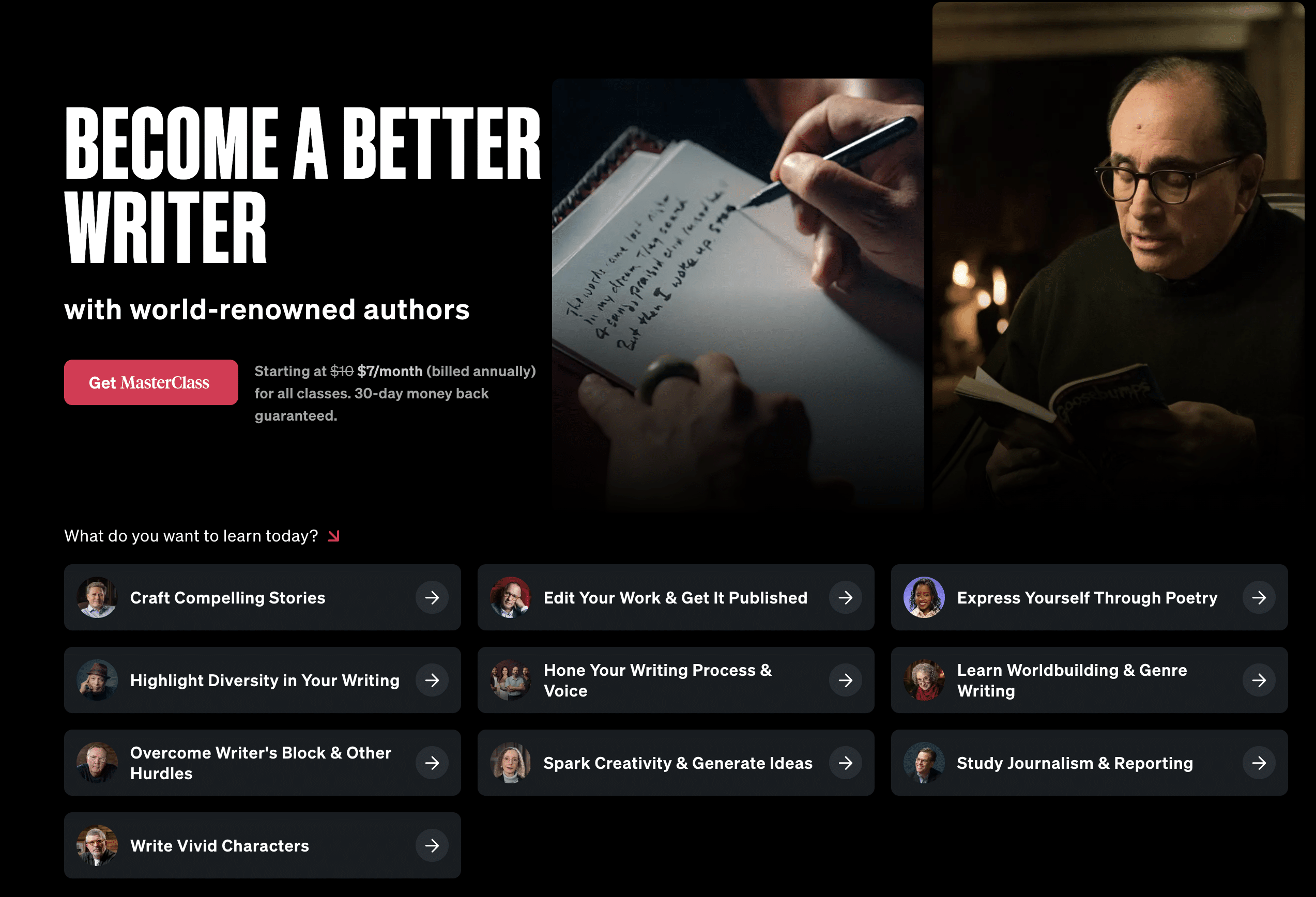 I genuinely love MasterClass. James Patterson’s outlining course was a game-changer for my writing career, and I still use his techniques today. That’s why I’m happy to recommend MasterClass as an affiliate partner.